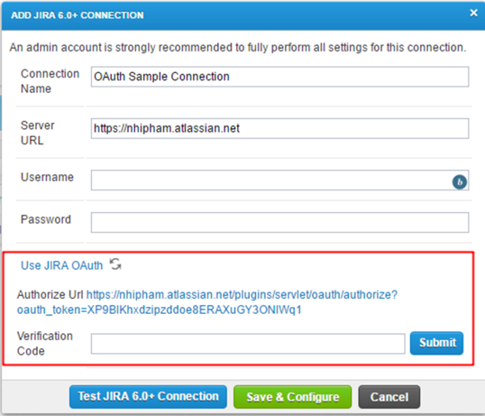 Enter the Connection Name and Server URL of your Jira instance. (Server URL is the Base URL of your Jira instance and is found in your Jira System Settings.)
