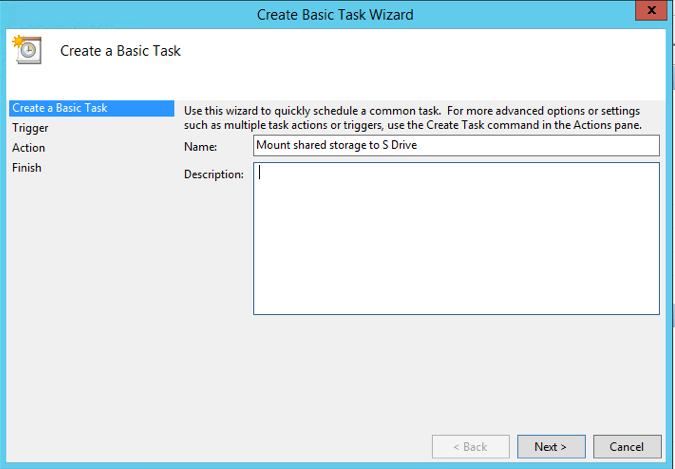 On the Create a Basic Task screen, enter a name for our task, such as "Mount shared storage to S drive", and then click Next.