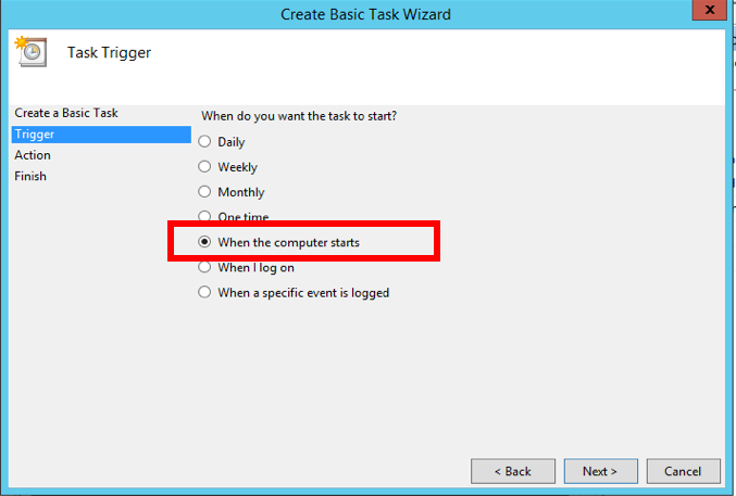 On the Task Trigger screen, select option When the computer starts, and then click Next.
