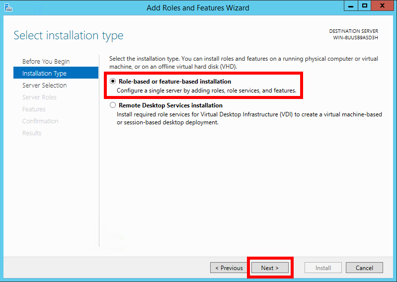 On the Select installation type screen, make sure the option Role-based or feature-based installation is selected, then click Next.