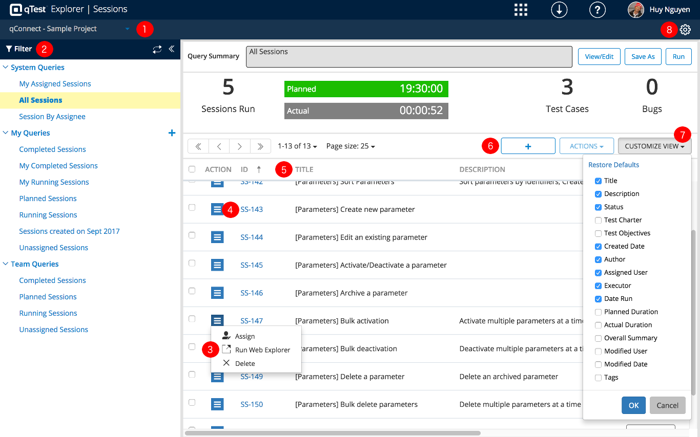 The Sessions module is the storage location for all planned and executed Explorer test sessions. This module provides the ability to plan sessions based testing and collect all exploratory test session data in one central location.