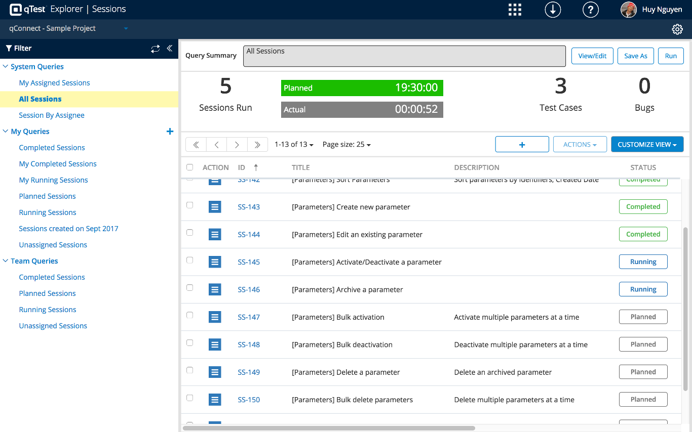 Once you select Sessions, you will be navigated to a data grid that displays any planned, running, reviewed or completed test sessions from Explorer.