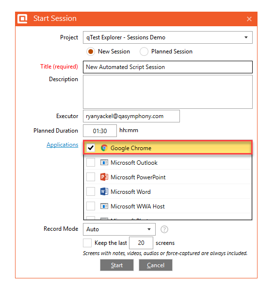 After installing the Integrated Desktop Explorer and the qTest Explorer Extension for Google Chrome, you can create an automated test script. ONLY select Google Chrome in the Applications list.