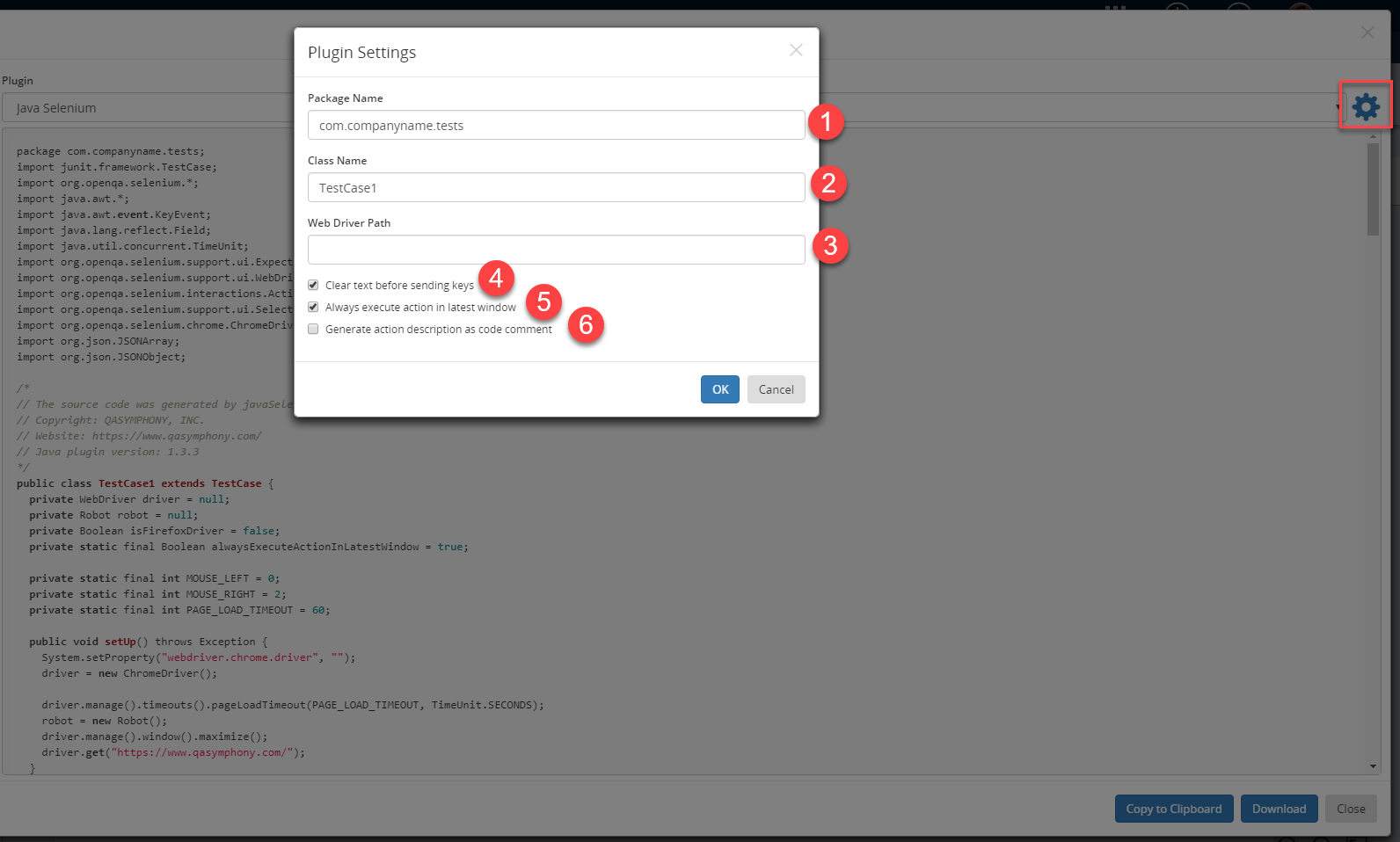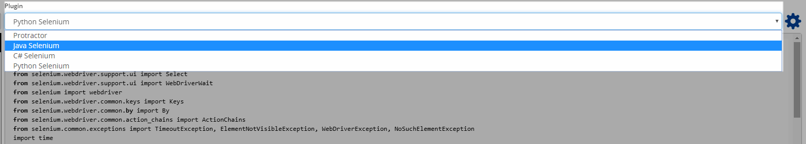 Configure settings for the selected plug-in by click on the gear icon next to the plug-in list. For example, if your selected plug-in is Java Selenium, you will be presented with default settings for this plug-in as shown in below screenshot: