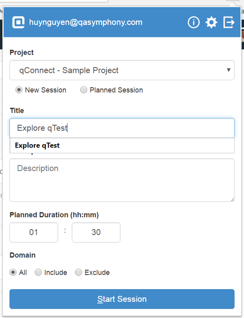 After installing Web Explorer, you can start a new recording session on its supported browser. The below screenshot shows the Start Session screen from Web Explorer for Google Chrome.
