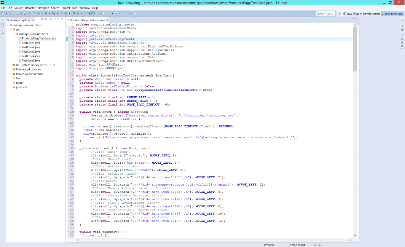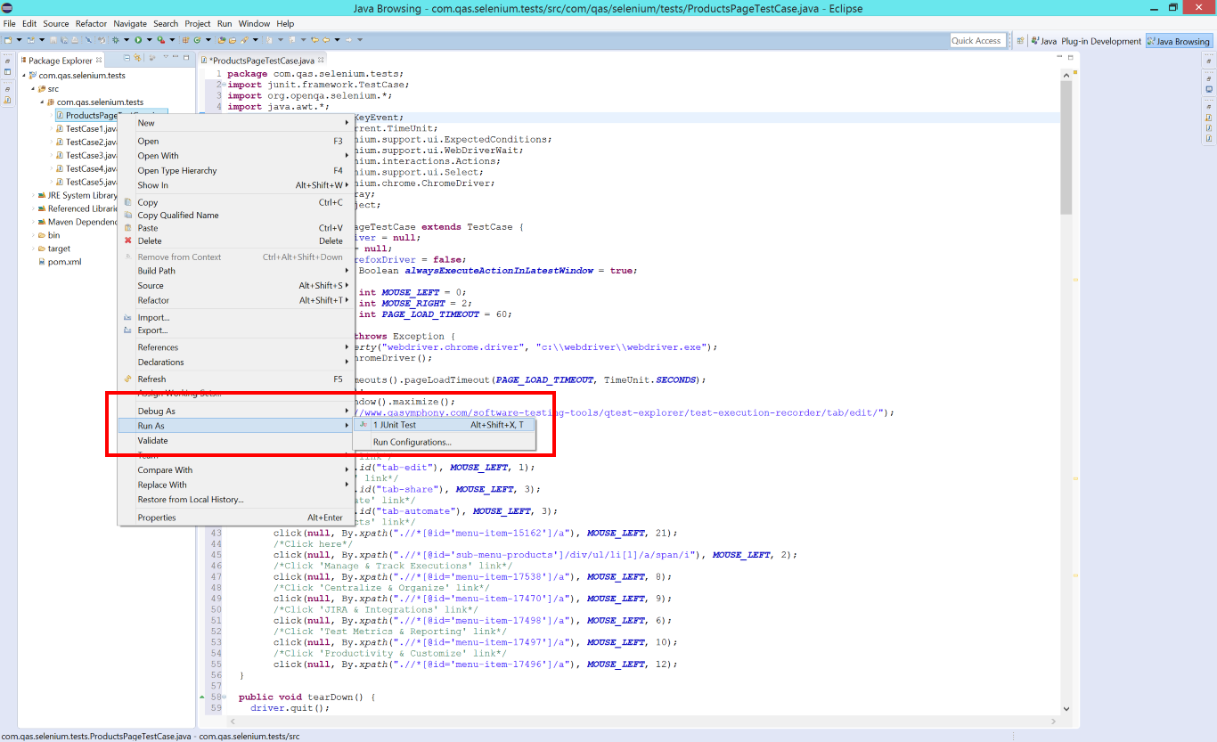 Assume you chose to download the generated script as save it as ProductsPageTestCase.java. Next step is to use that script in your automation project. Below is the screenshot showing a Selenium project in Eclipse IDE including the downloaded ProductsPageTestCase.java