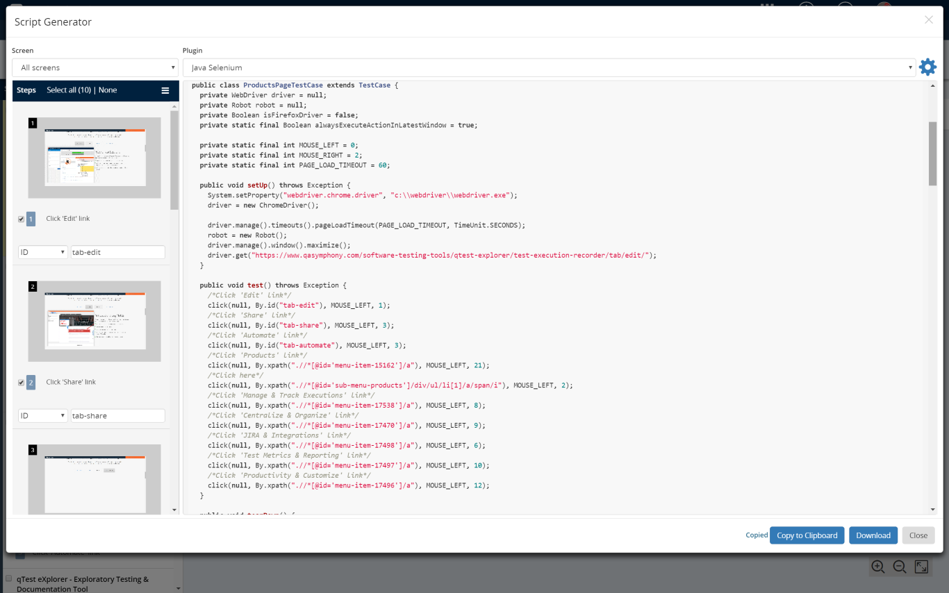 The automated script generator is a popular feature used by teams accelerating their move to test automation from exploratory and manual test cases. Teams can use the Sessions module to automatically generate web automation test scripts after their qTest Web Explorer or Desktop Explorer sessions have been completed.