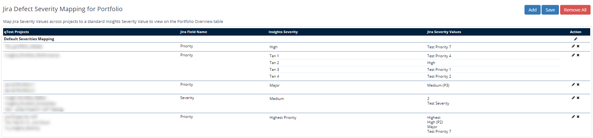 Let's say you have a portfolio that contains four projects from Jira, and you want to prioritize these defects on a standardized graded scale in Insights to simplify the data you're reviewing. Each project has a different name for a defect's highest level of severity: Highest, High (P2), Major, and Test Priority 7.