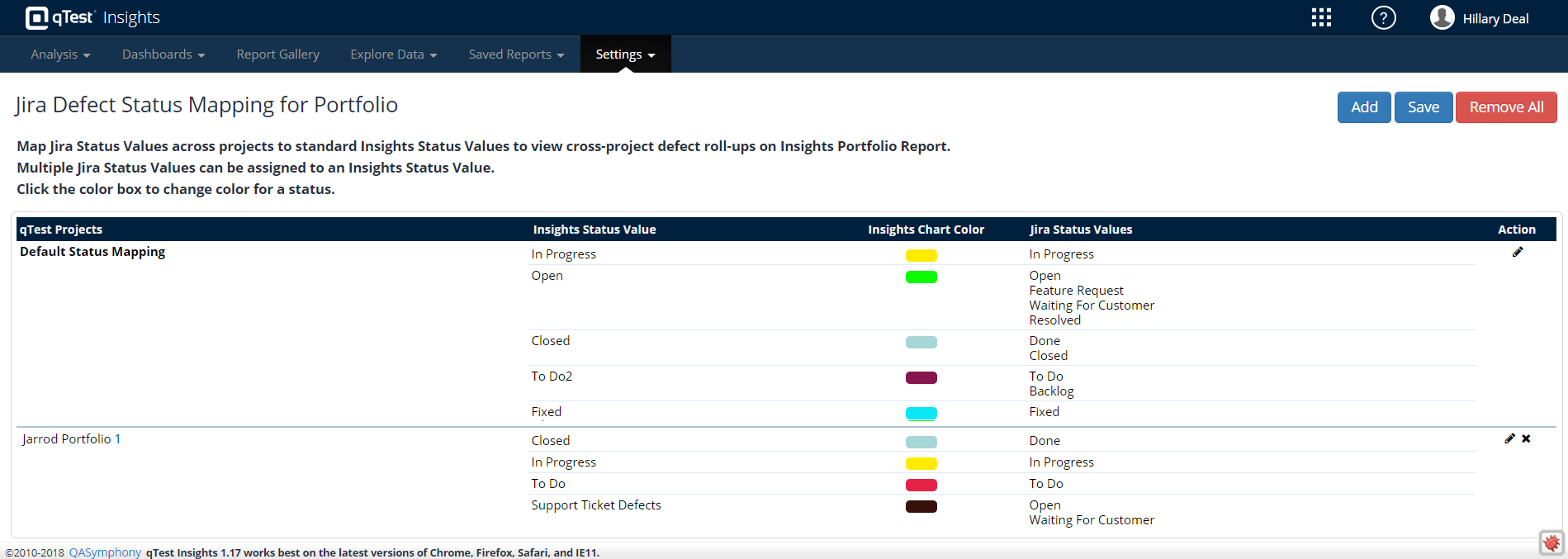 - Jira Defect Status Mapping: Map your Jira defect statuses to equivalent Insights status values. You can also assign a color to the Insights status to color-code your Portfolio Report.