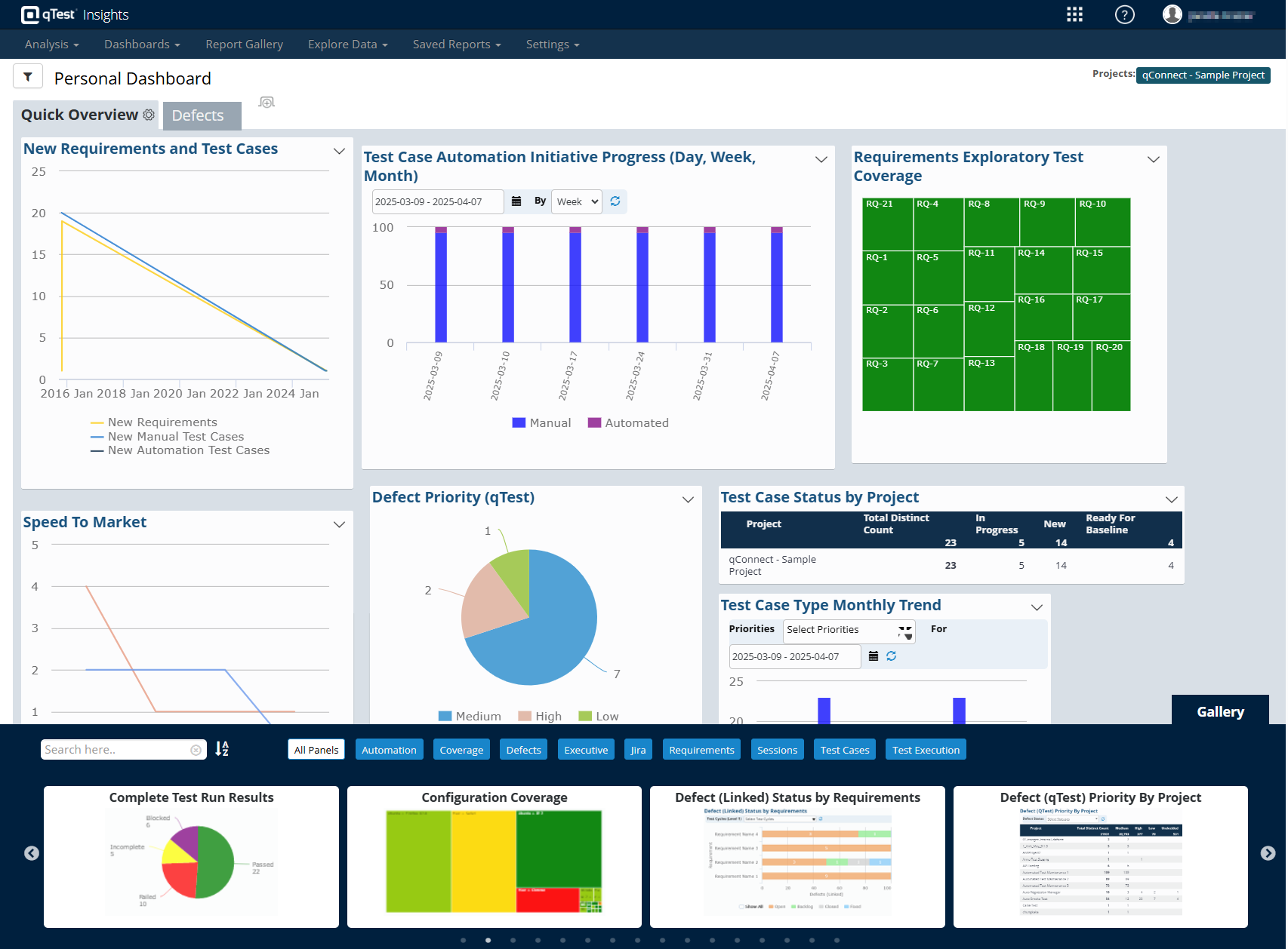 qTest Insights offers a variety of panels that you can use to view datasets from many different areas in your testing process. Depending on your needs, drag and drop these panels from the Gallery to create unique dashboard views.