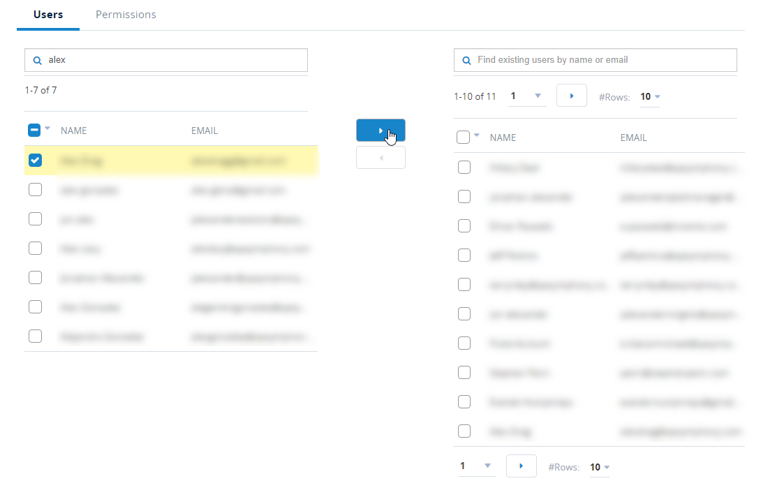 Search for your users that you would like to add. Select the check box next to their name, and then select the right arrow icon to add them to the list of existing users of that User Group.