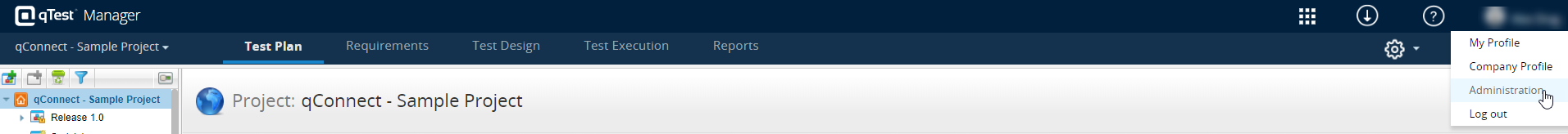 In qTest Manager, select Administration from your username drop-down menu.