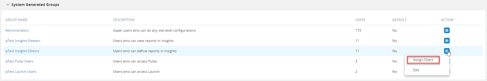 Select the Action icon next to the Insights Editors User Group, and choose Assign Users.