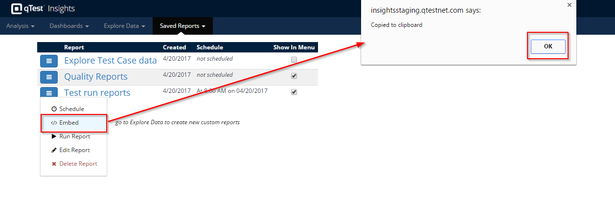 Reports listed in the Explore Data and Saved Reports tab, contain the Embed Script