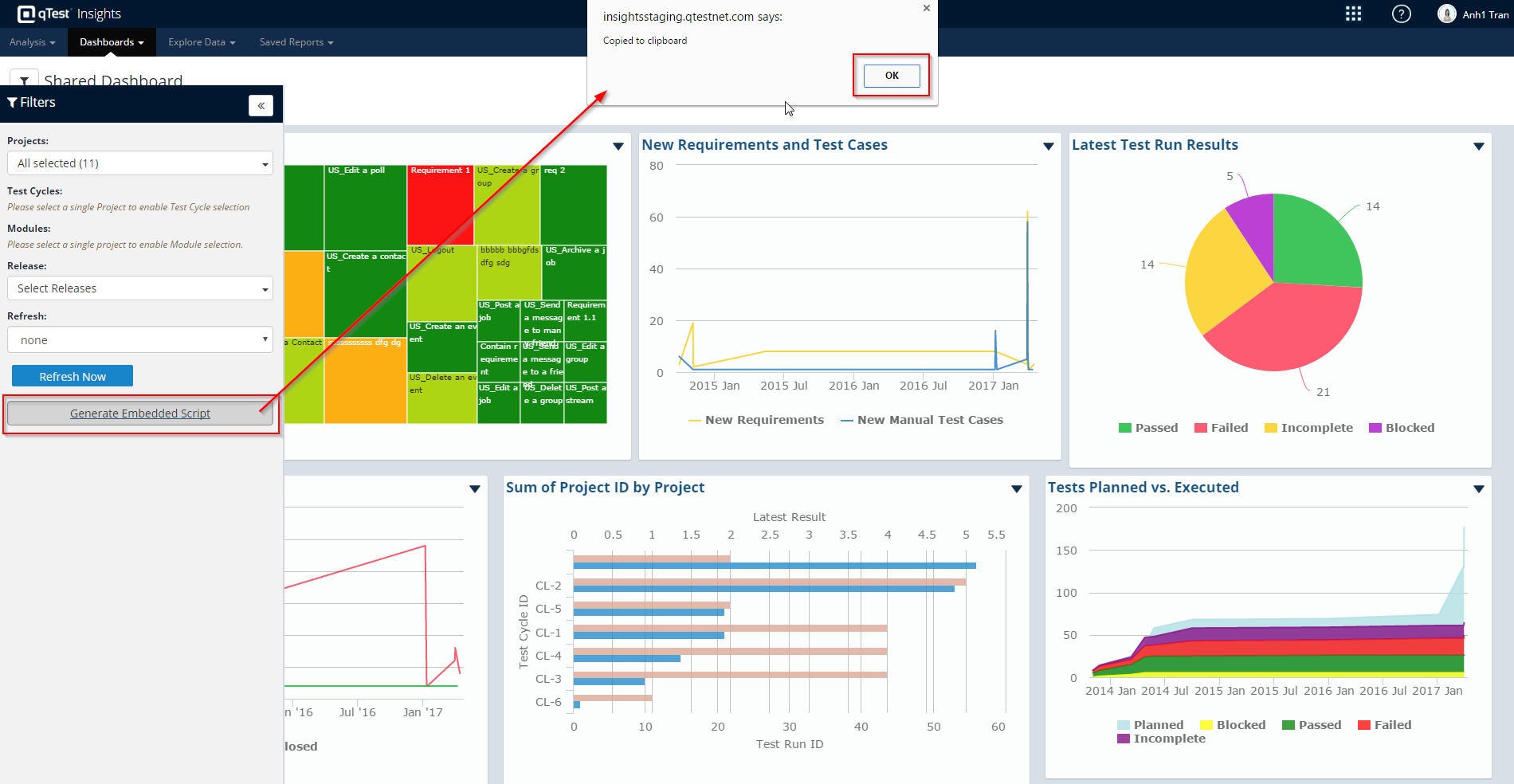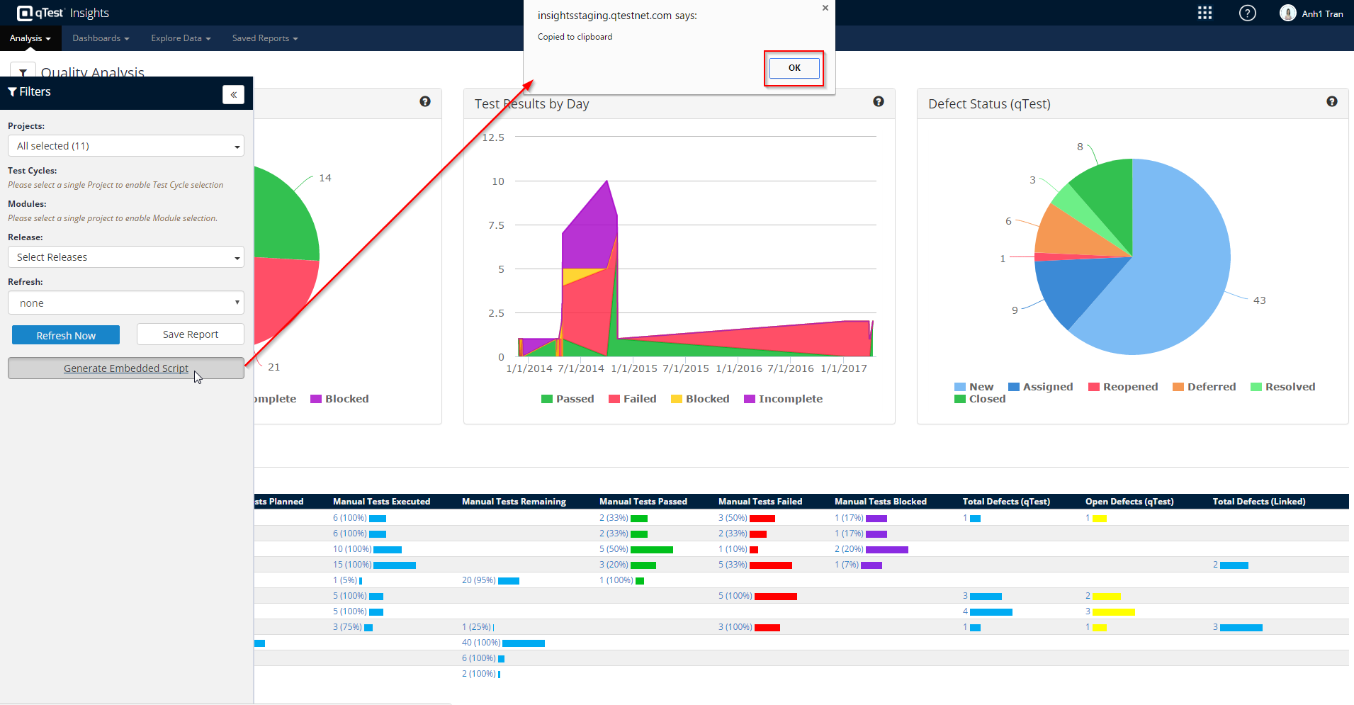 You can embed a report on a website, such as Atlassian Confluence or an internal wiki, by adding a generated JavaScript code for the report to the website. A qTest license is not required to view data from an Embedded Report. However, you will need the Insights Editor Admin Profile assigned to your User Name to use the Embed Script feature. This can be performed by a Site Administrator.
