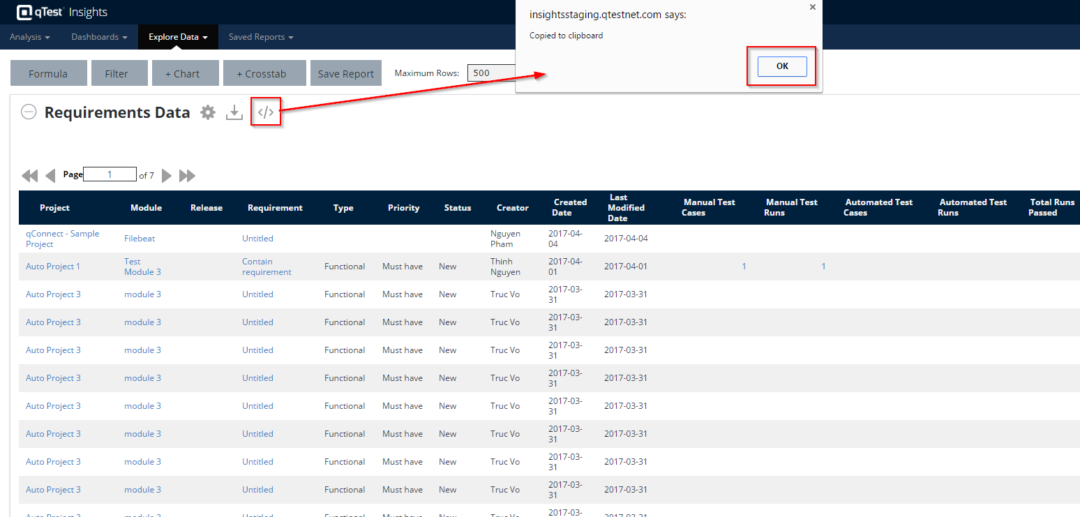 Individual reports in the Explore Data and Shared Reports offer the embed script icon