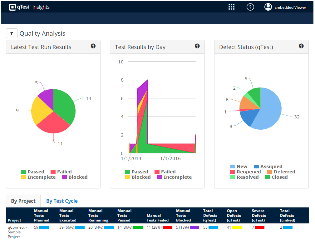 Below is a screenshot of how the Quality Analysis report appears once you copy its embedded script to a website. This embedded report will remain static, so users will not be able to navigate through other features/sections of qTest Insights or drill-down into the data of the report without a qTest license.