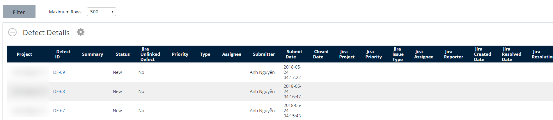 Defect Details: Table data for all the defects created in Jira or Manager. The data is ordered by ID and excludes these statuses: Closed, Deferred, Withdrawn and Rejected.