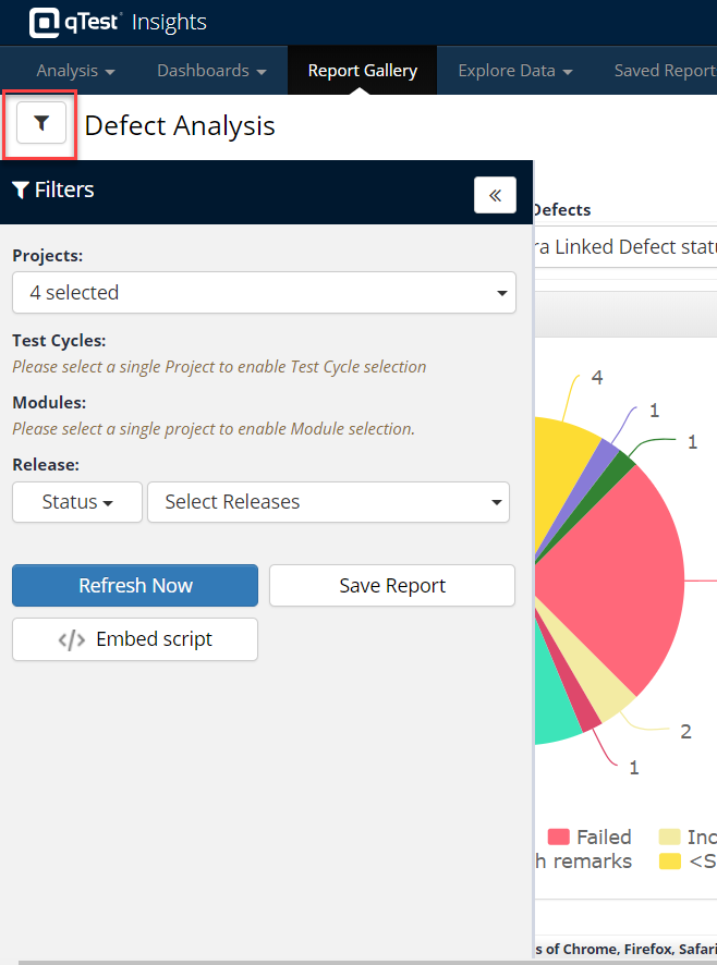 Users can apply the Global Filter to the Report and then save filter settings so that teams can re-visit the report without having to reconfigure filters. Users will also be able to create an embedded URL for their Defect Analysis Reports.