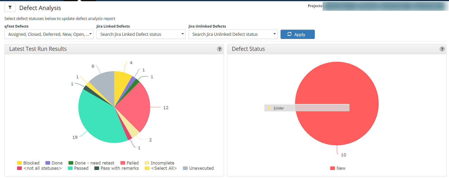 Defect Analysis Report: Users can view both the latest Test Run results and Defect Statuses concerning both linked and unlinked Defects. This report allows users to analyze the quality of development.