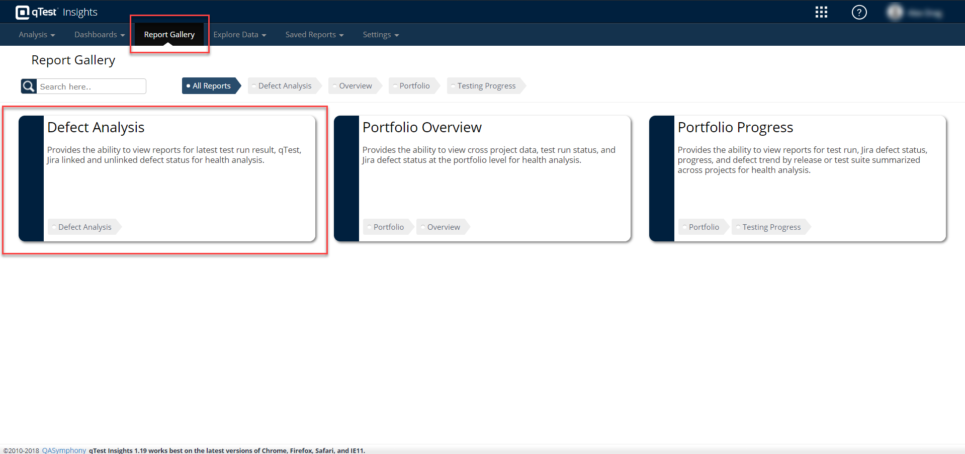 The Report Gallery page loads and displays the Portfolio Overview and Portfolio Progress cards.