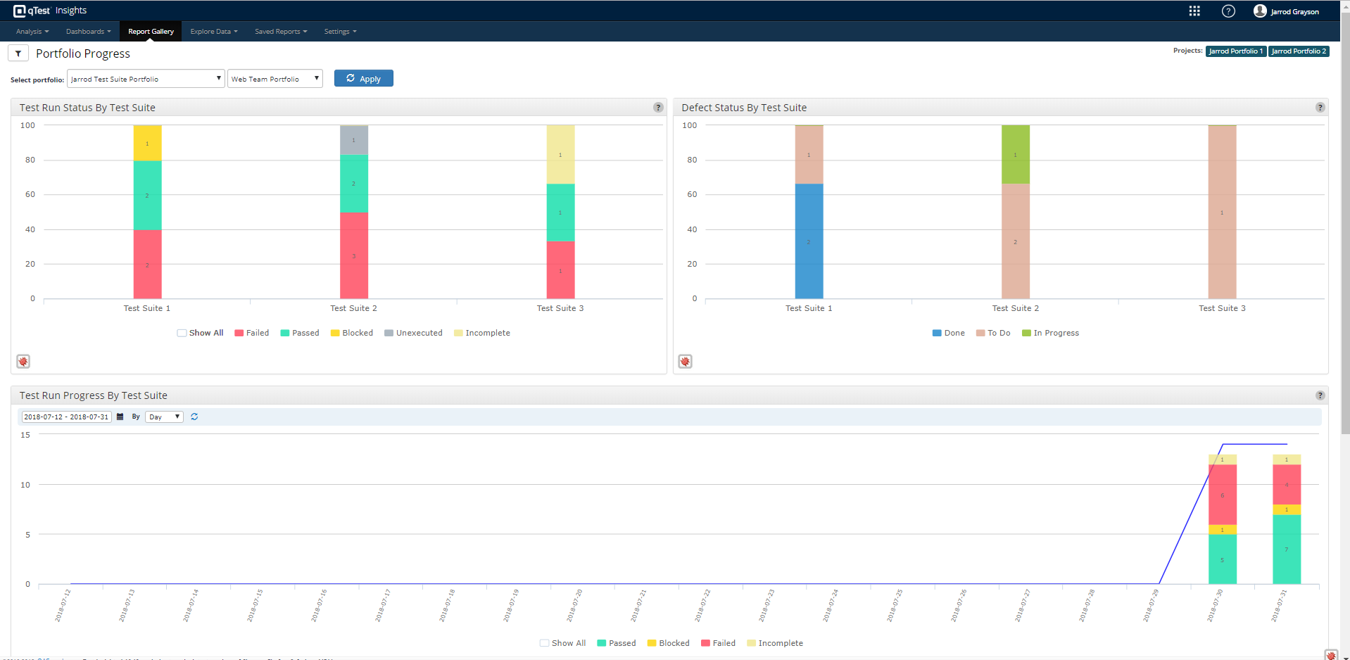 Portfolio Overview: Allows you to view cross-project data, Test Run status, and Jira Defect status at the portfolio level for health analysis.