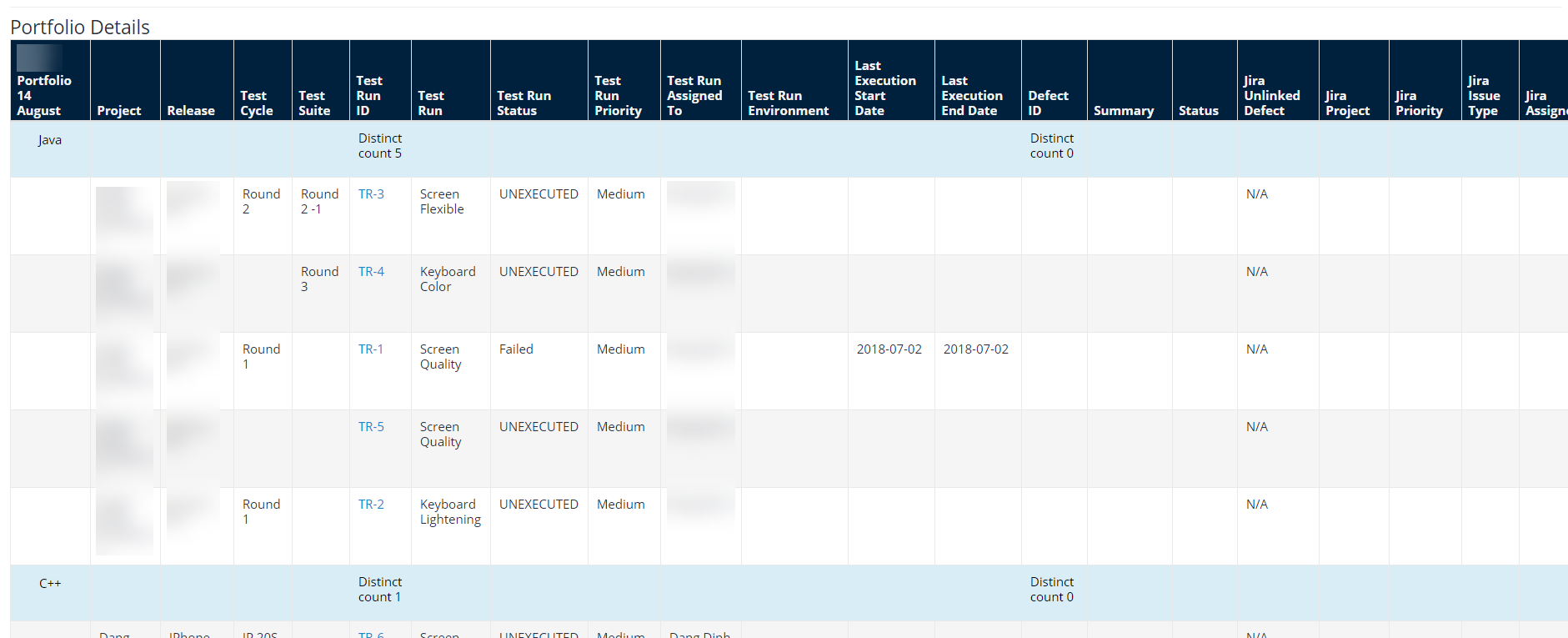 The Portfolio Details Table is located within the Portfolio Overview report at the bottom of the page. It includes details for Test Runs, Jira defects (both linked and unlinked) and where your Jira Defect Custom fields get applied. Additionally, you will see the conditional status formatting associated with the chosen Portfolio Report in the data cells.