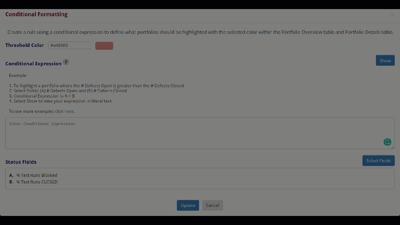 You can create Conditional Formatting for an individual Portfolio Report that defines criteria for selected Test Runs and Defect Status data. You will create a rule, using a conditional expression, to define the data results with the selected color within the Portfolio Overview table and Portfolio Details table.