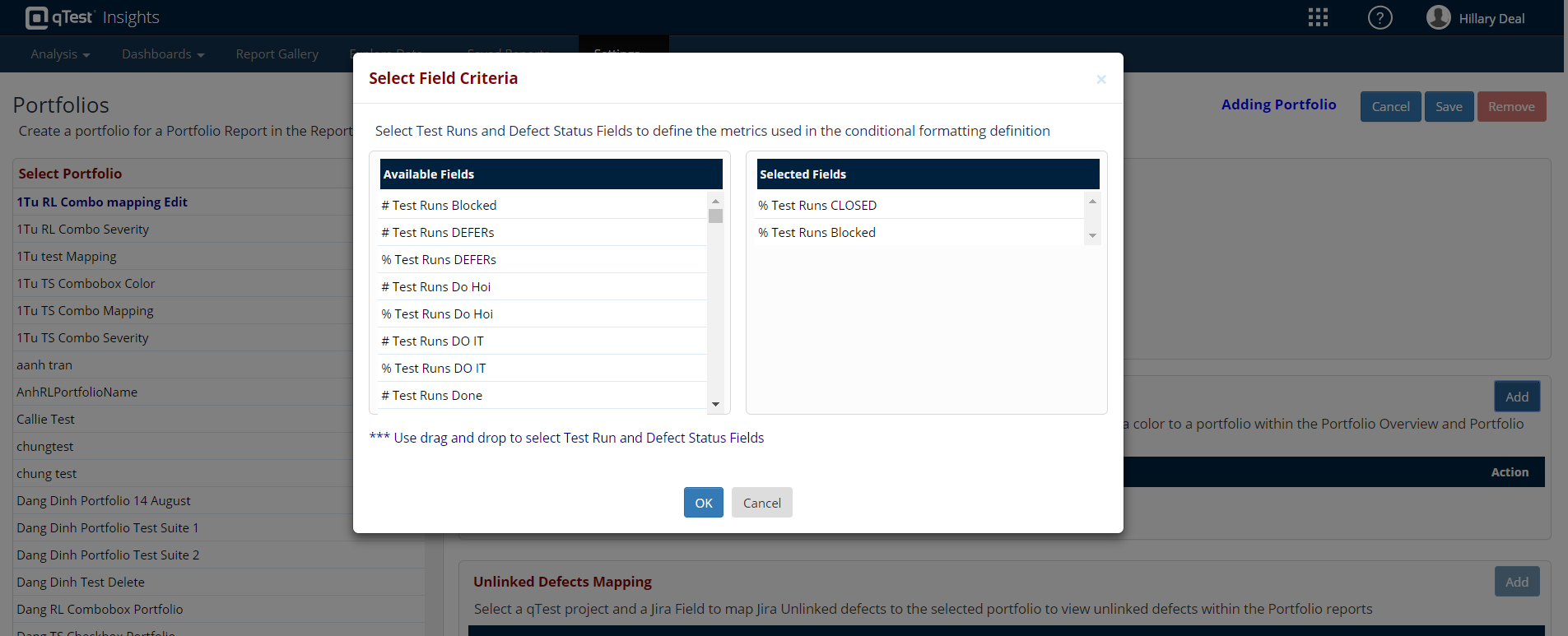 The values shown in the Available Fields column populate from both your Test Run statuses in Manager and your mapped Insights Defect values.