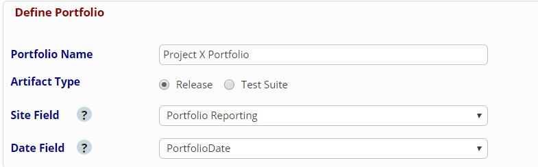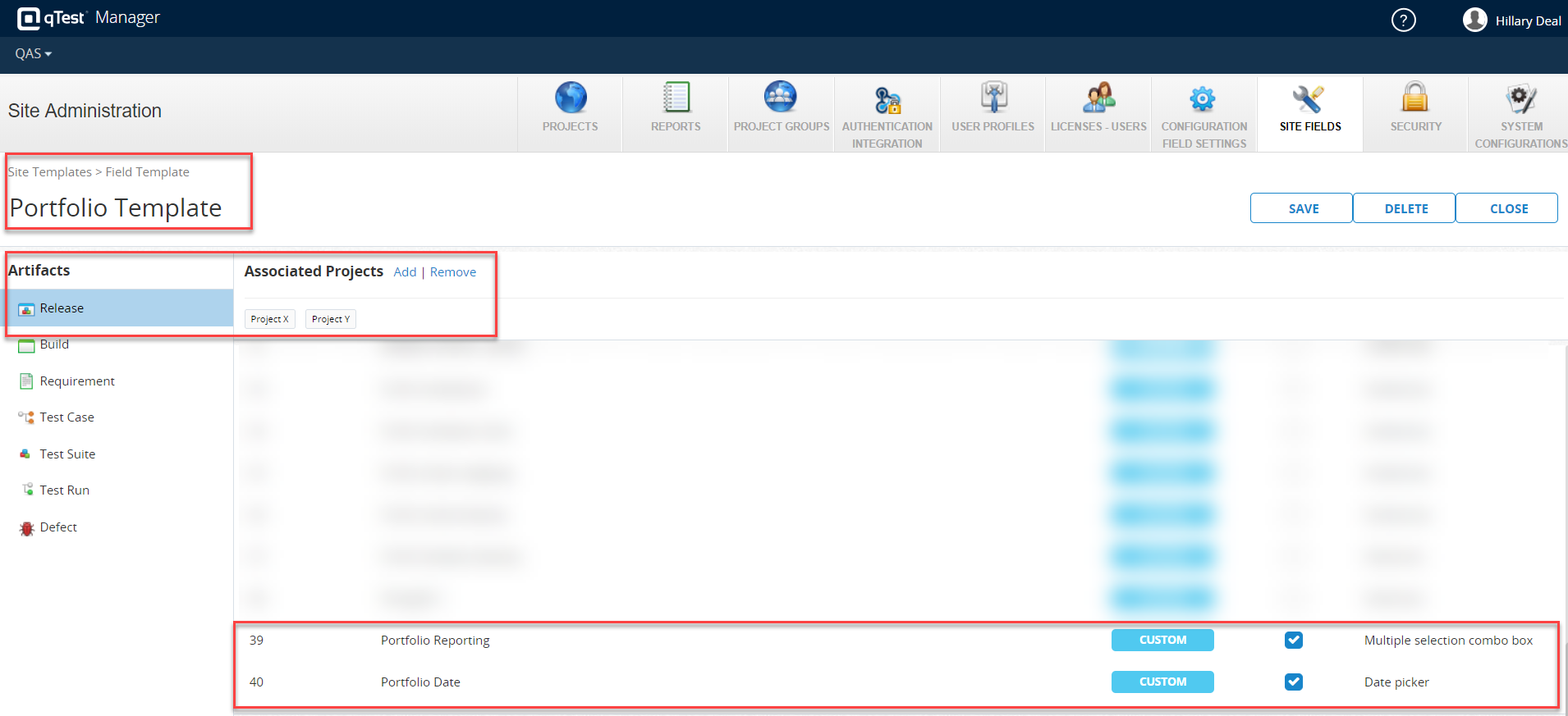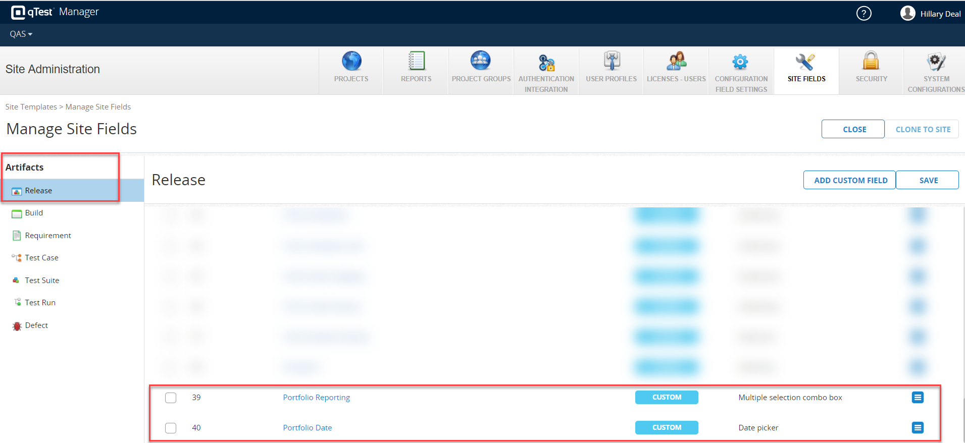 Define custom Portfolio Site Fields with values in qTest Manager Site Administration. These custom site field values are used to group Releases or Test Suites across qTest Projects, so they are reportable on the Portfolio Report you create. Refer to Site Fields for instructions on how to create a site field.