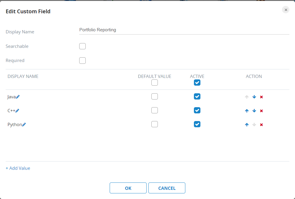 Example: Perhaps your software requires different coding languages for different Releases that you want to report on over several projects. Therefore, the values might be your different coding languages: Java. C++, and Python.