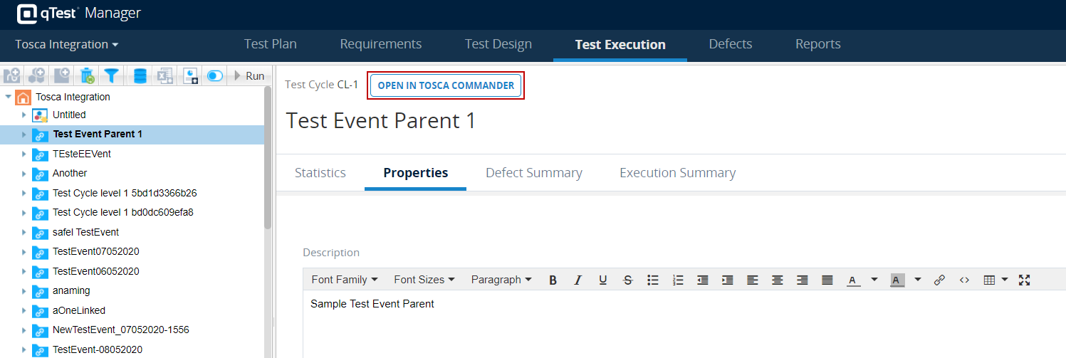 You can access linked Tosca objects directly from qTest. To view a linked object in Tosca, click Open in Tosca Commander on the object screen.