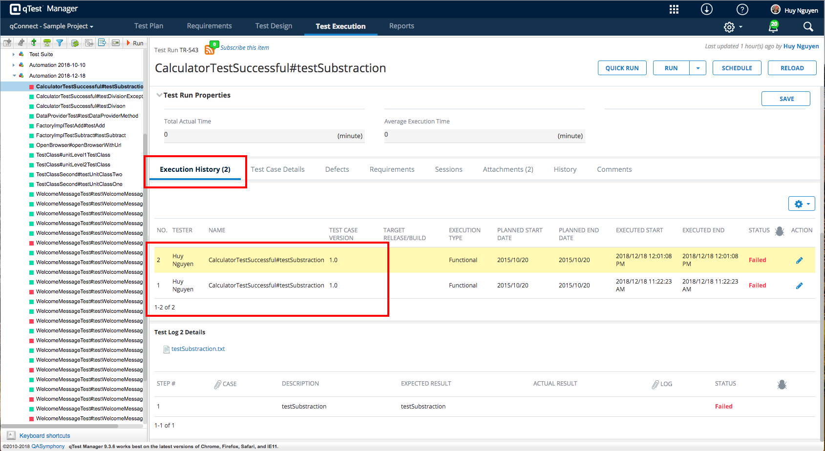Now get back to Test Execution of qConnect Sample Project in qTest Manager. Click on each test run that was scheduled to be executed, you'll see the Execution History of each test run was updated with two test run logs: one test log created when the agent was executed in the first time, and one test log for the scheduled job execution.
