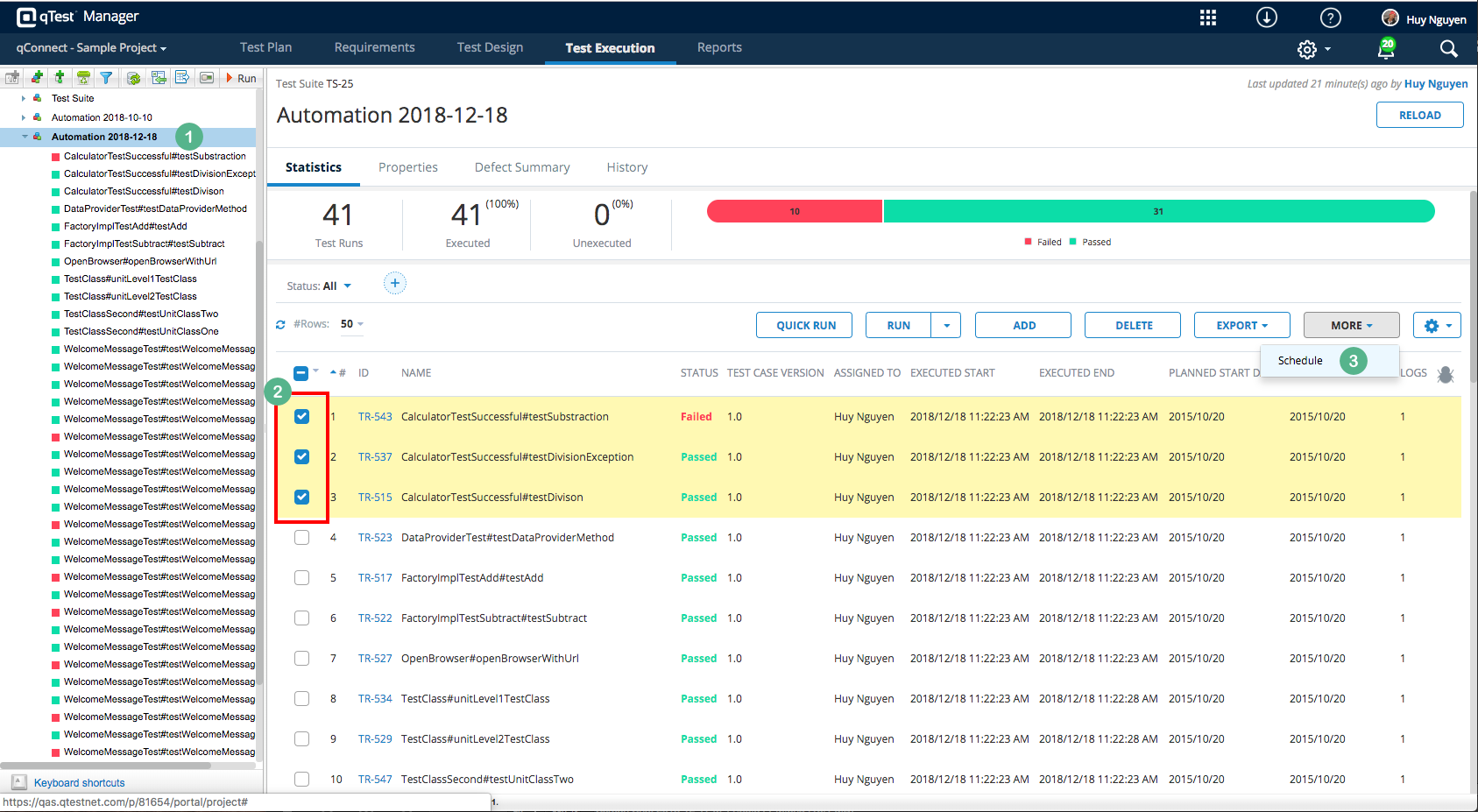 From qTest Manager, select the project qConnect Sample Project then click the Test Execution tab. Do the following: