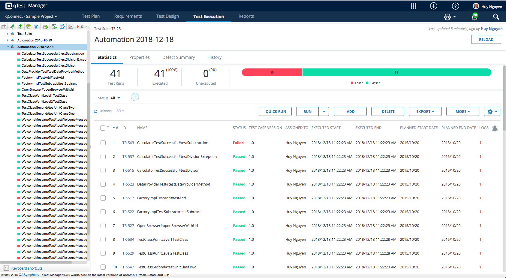 Next, access qTest Manager. Select qConnect Sample Project then go to Test Execution module. You'll see the test results submitted to qTest Manager as Test Runs under a Test Suite named Automation 2018-12-18, as below.