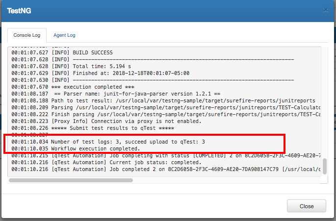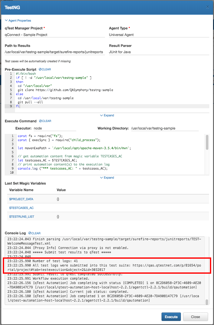 Click the Execute button to execute the agent. Once execution completes, the Console Log shows all the test results have been submitted to qTest Manager, as highlighted in the screenshot below.