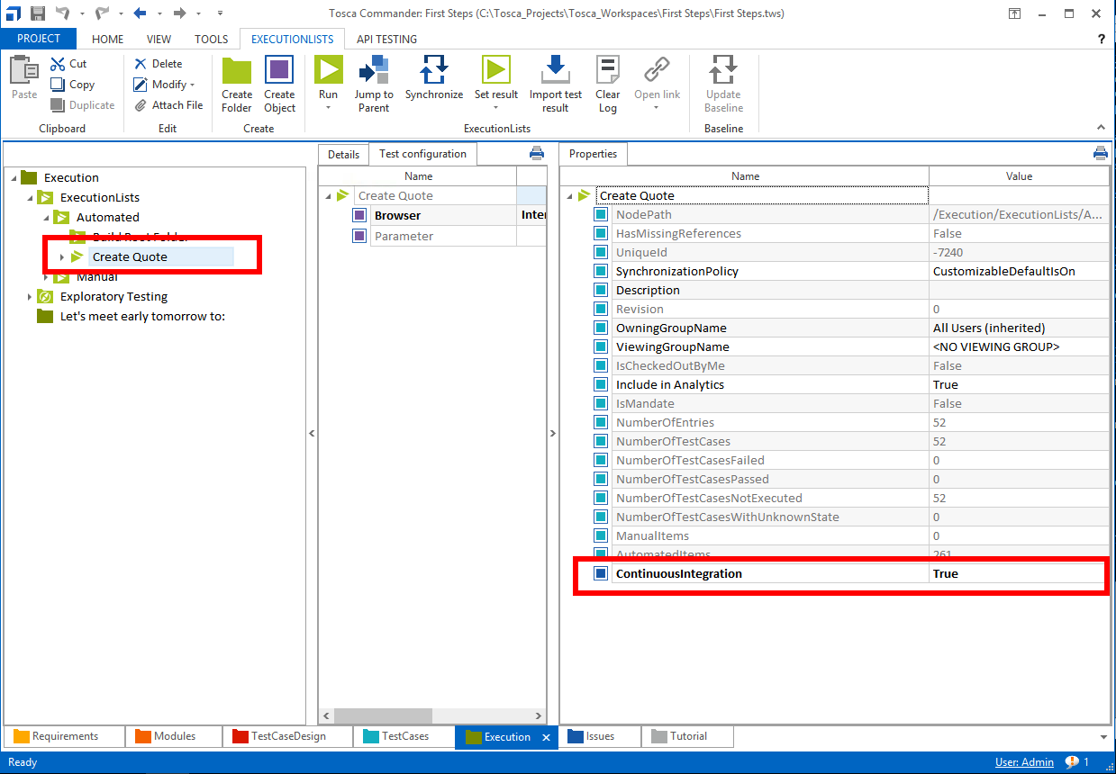 Please note that the property ContinuousIntegration of the Create Quote test case must be set to true, as shown below.