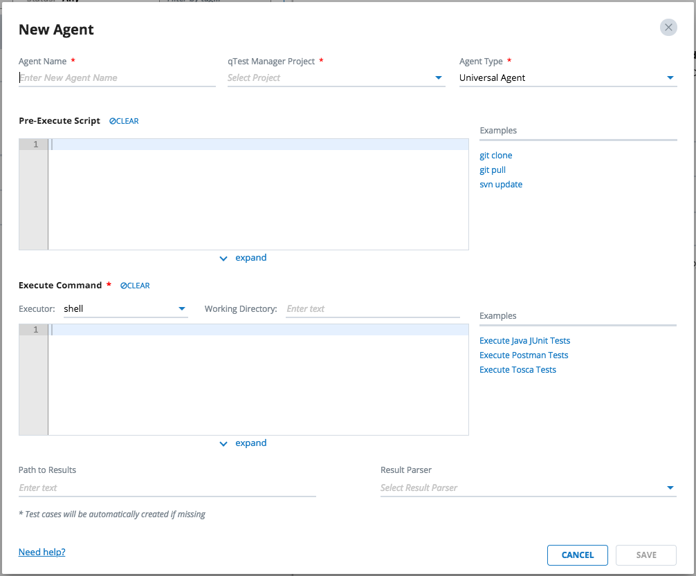 If you want the Universal Agent to submit test results to qTest Manager, you must specify values for both Path to Results and Result Parser. Otherwise, you must do that yourself via Execute Command.