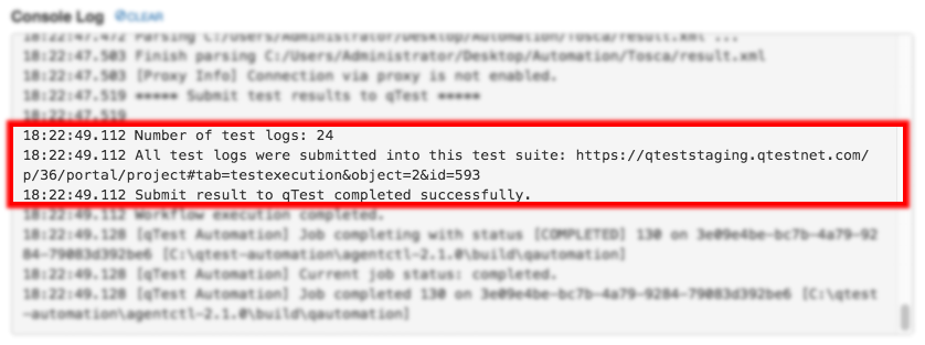Select the Execute button to kick off the agent execution and you will see the logs shown in the Console Log section. If the execution is successful, you'll see the test run logs being submitted to qTest Manager.