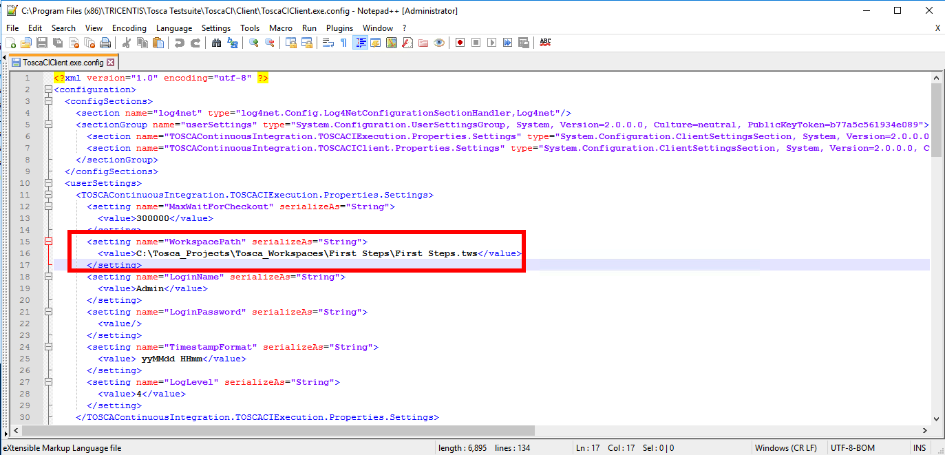 Open config file at C:\Program Files (x86)\TRICENTIS\Tosca Testsuite\ToscaCI\Client\ToscaCIClient.exe.config in a text editor.