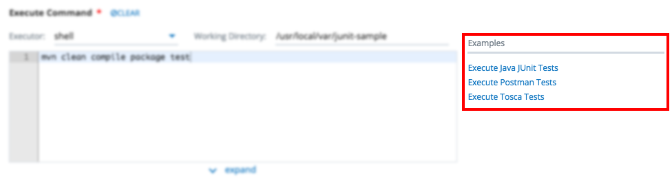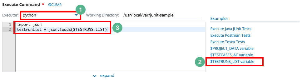 This snippet generates code that uses $TESTRUNS_LIST variable in Execute Command. The example below shows how the snippet looks like specific to the selected Executor.