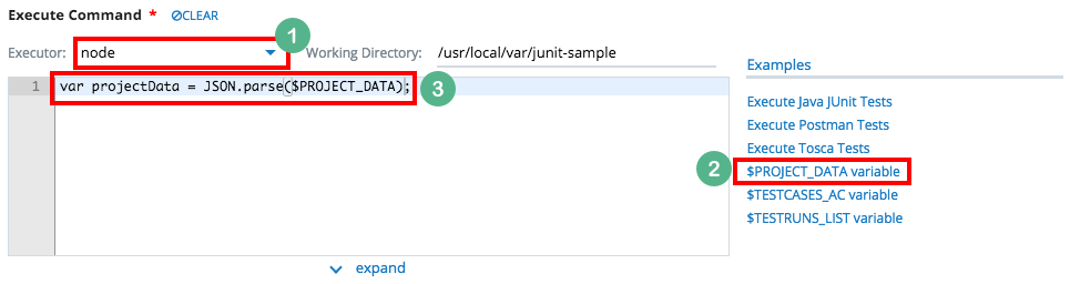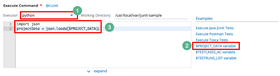 This snippet generates code that uses $PROJECT_DATA variable in the Execute Command. The example below shows how the snippet looks like specific to the selected Executor.