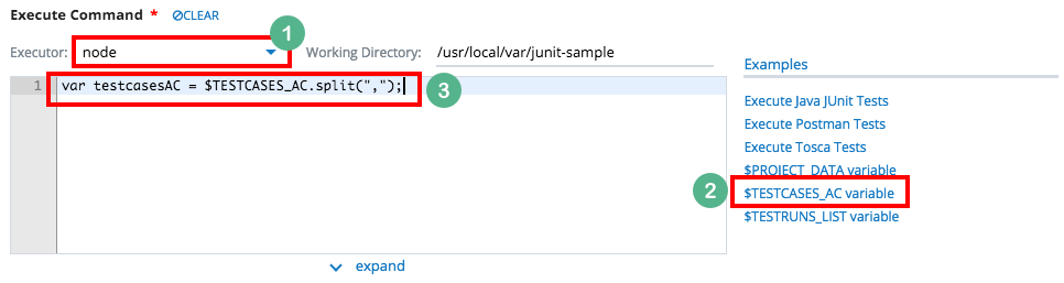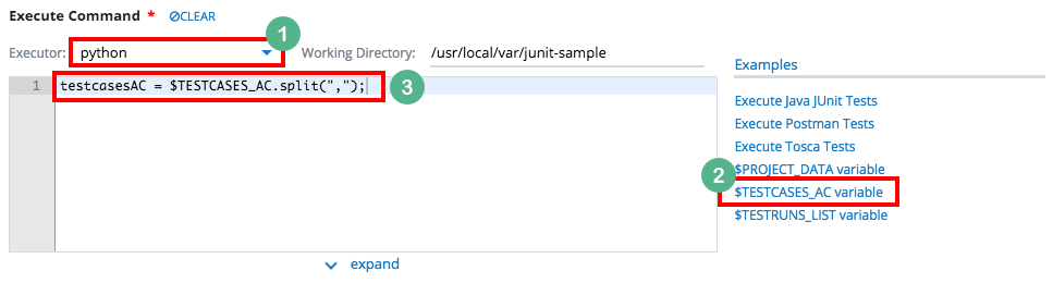This snippet generates code that uses $TESTCASES_AC variable in Execute Command. The example below shows how the snippet looks like specific to the selected Executor.