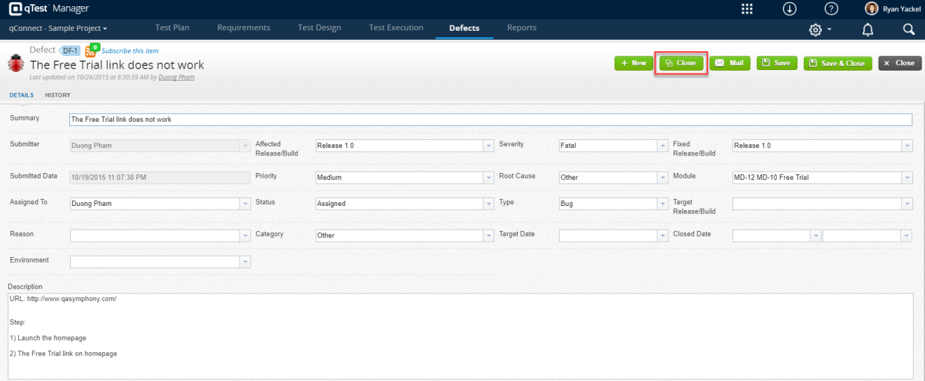 Edit any details in the cloned Defect, as needed.
