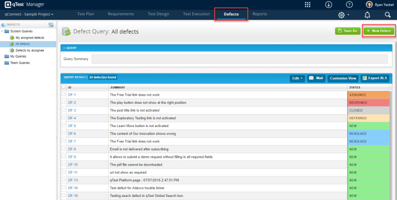 The Defects module is where users can create, view, and edit Defects that have been created within the internal defect tracker. qTest Manager's internal Defect tracker is simple, yet powerful, allowing you to manage Defects in real-time as they are raised.