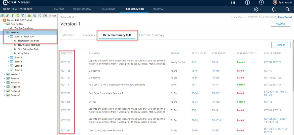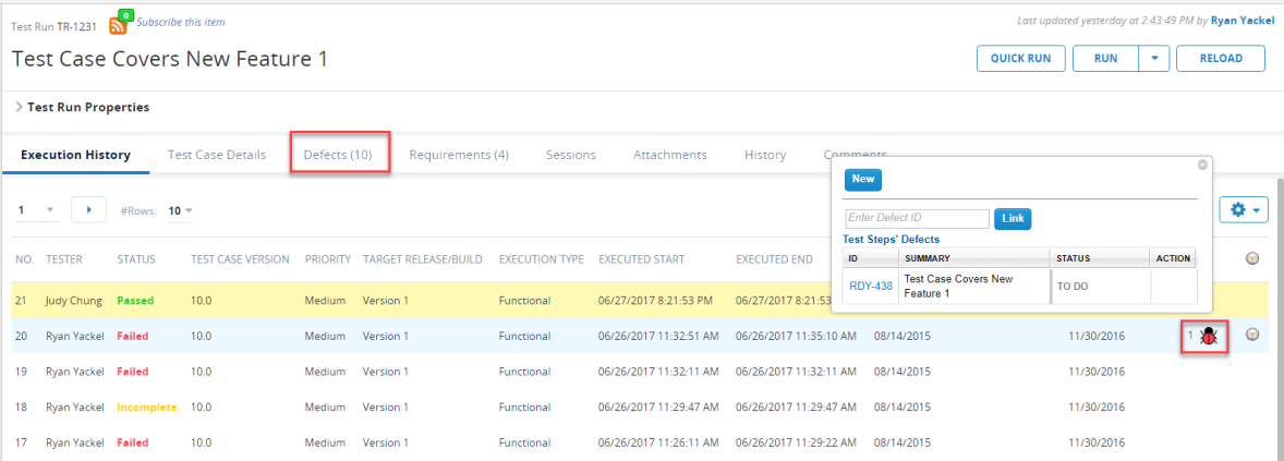 Defects tab of Test Run