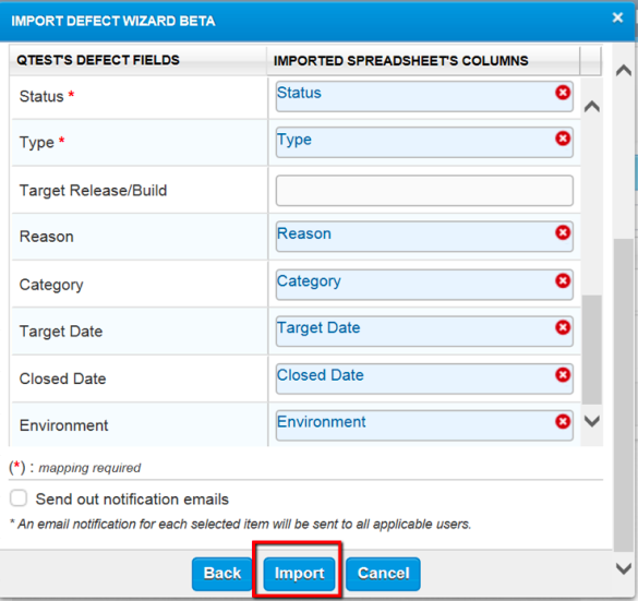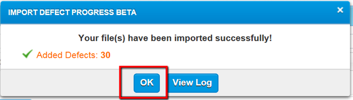 When finished mapping all fields, click the Import button. The Defects will be created within qTest Manager with the information from the Excel spreadsheet. qTest Manager will also assign a Defect ID to each defect. A pop-up is displayed which indicates the number of new Defects that have been added to qTest Manager.
