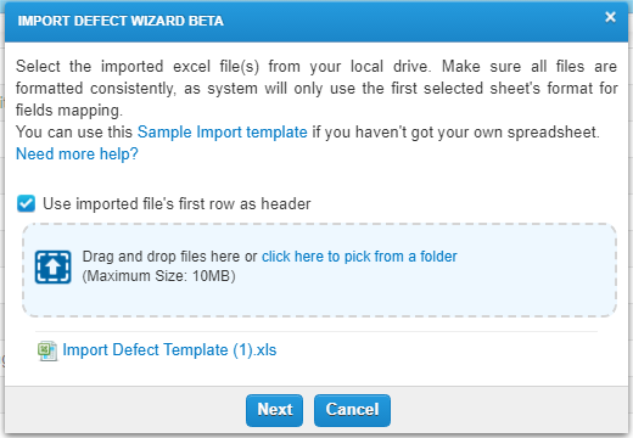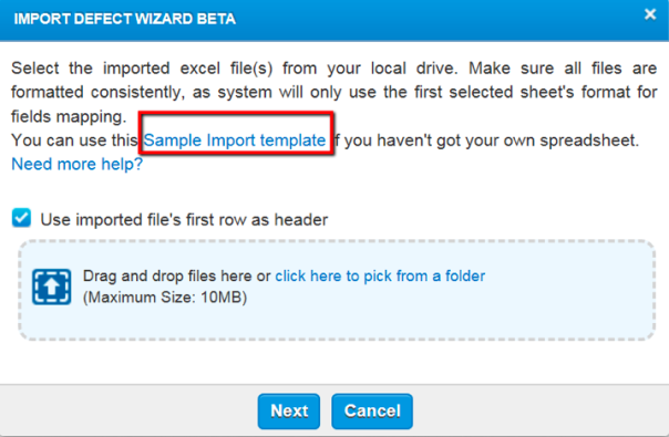 The Import Defect Wizard Beta screen is displayed. Click the Sample Import Template link to download this sample file.