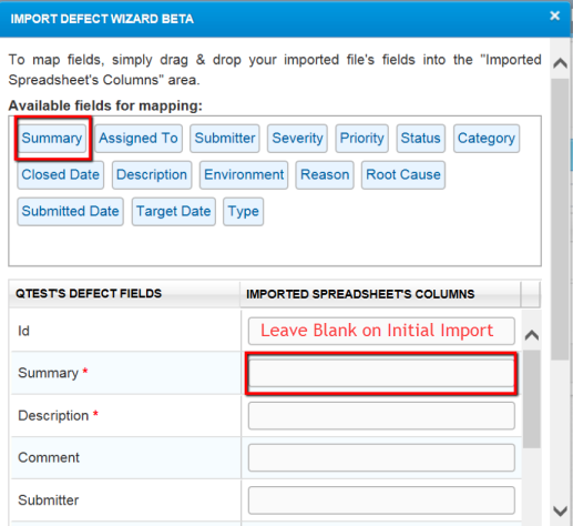 Select the Next icon. The Import Defect Wizard Beta screen is displayed. The column names from your Excel spreadsheet are displayed in the Available fields for mapping area at the top of the screen.