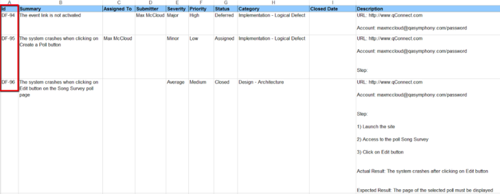 When modifying existing Defects using Excel you must create a column in the Excel spreadsheet for the Defect ID so that when the spreadsheet is imported, qTest applies the updated information to the correct Defects. The Defect ID assigned to each existing defect in the selected project in qTest Manager is displayed in the ID column, as shown in the following screenshot.